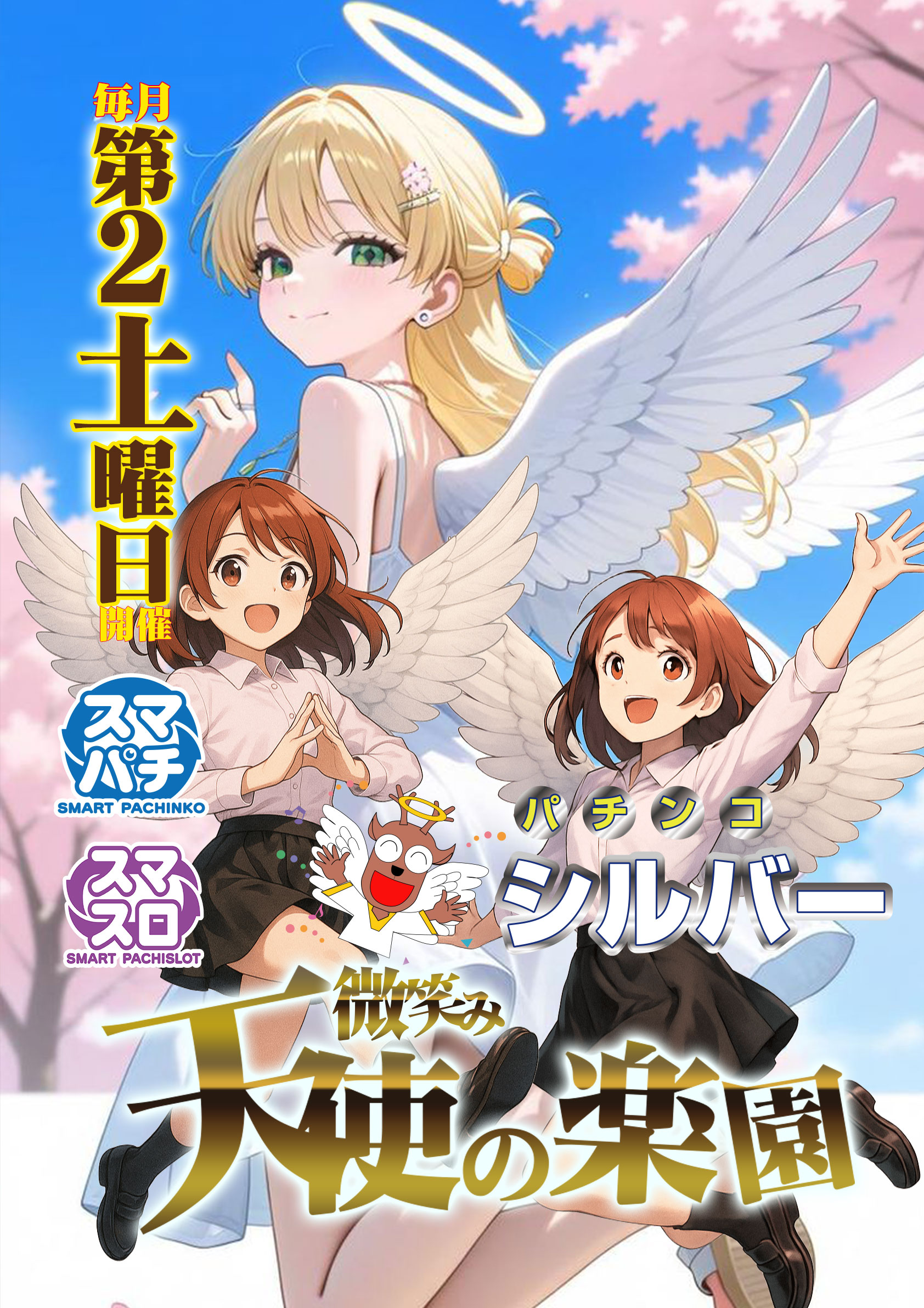 当店の接客は、グランドオープン当初から、定評がありましたが、抜群の笑顔とお声がけより、あるお客様から、「まるで、天使のような振る舞い。ありがとう。この店のスタッフはみんな、スマイルエンジェルだね」とおっしゃって頂きました。私たちは、このお客様から頂いたありがたいお言葉を、そのままキャッチフレーズとして使わせて頂いております。パチンコ業界で一般的な画一化されたサービスとは一線を画し、独自の接客サービスを提供している当店では、このお言葉を頂いた感謝の意味も含め、毎月行われる、「天使の楽園」という企画において、スタッフが全員、天使の衣装をまとい、いつも以上のスマイルと演技演出で楽しんで頂いております。